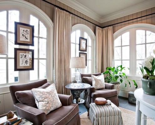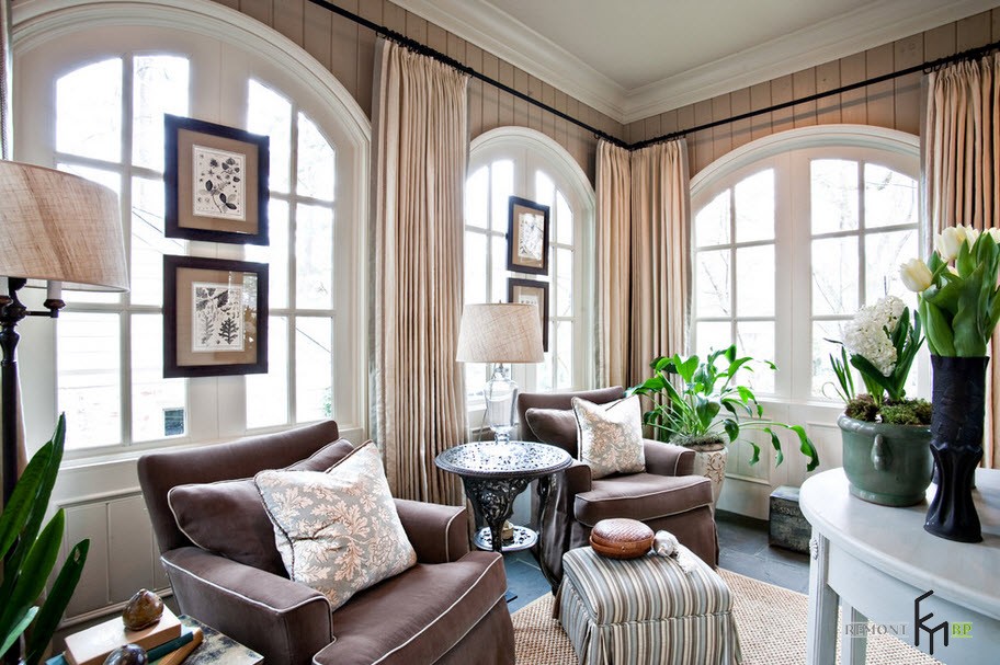 Индивидуальность штор вполне может быть определена особенностями окна. Не всегда окна имеют прямоугольную форму – арочные окна тоже популярны и требуют к себе индивидуальный подход. Эту индивидуальность лучше всего выразят шторы, конструкция которых будет сообразна оконному проему. Как правило, шторы на окнах, отличных от прямоугольных окон, не должны скрывать их особенность.