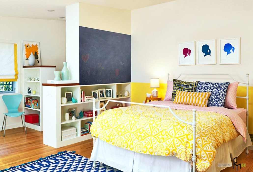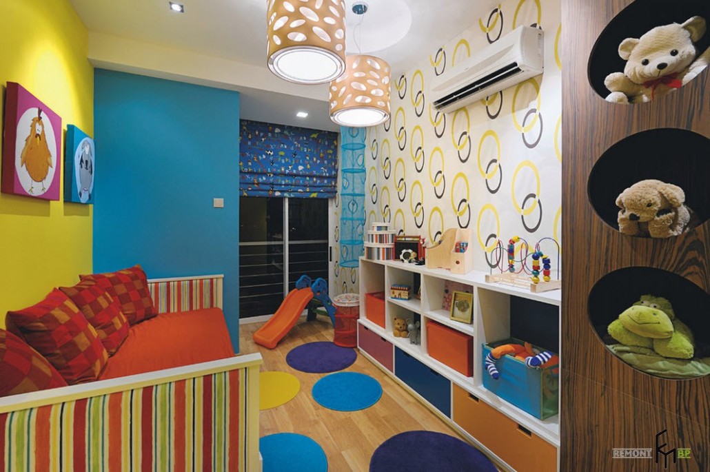 Сочетание с зеленым или голубым подарят необходимый ребенку заряд энергии и сделают интерьер легким и свежим. Желтый хорошо смотрится со всеми оттенками синего. В зависимости от желаемого результата можно использовать любой тон из всего спектра: