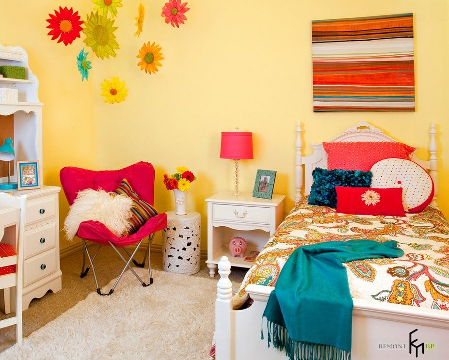 После того, как основные поверхности будут окрашены, можно будет постепенно добавлять, убирать или перемещать желтые аксессуары в комнате. Отличным способом «осветить» темные уголки комнаты, будет размещение в них «солнечных» предметов. Такой дизайнерский ход спасет детскую комнату, расположенную на северной стороне, от недостатка света и тепла.