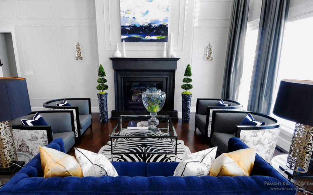 При работе с таким сочетанием дизайнеры советуют основным брать синий, а черным лишь подчеркивать формы. Это придаст интерьеру утонченности и элегантности.
