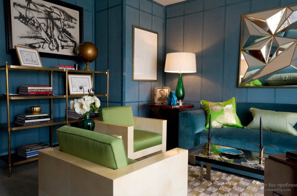 Однако не стоит забывать, что данное сочетание все же очень холодное и если такая атмосфера приветствуется, то можно смело выбирать насыщенные оттенки синего.