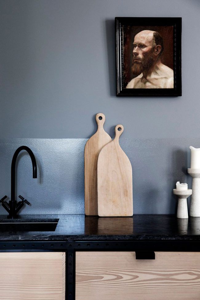 Для органичного внедрения черного цвета синие тона должны быть на порядок светлее. Однако черный не всегда уместен, поэтому прекрасной альтернативой ему может стать темно-синий цвет, которые отнюдь не хуже справляется со своей задачей и делает комнату более светлой и уютной.