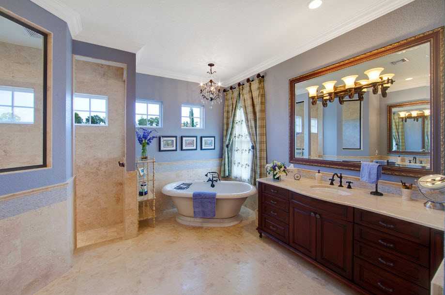 Освещение в ванной комнате должно быть таким, как на киностудии Мосфильм или Долженко. Зритель его не замечает, но оно есть. Так оно должно быть и в вашей ванной – рассредоточенным, мягким и приятным. Ванная комната – это же своего рода комната релаксации, а не дискотеки. При правильной организации освещения, успокаивающий эффект синего цвета в дизайне комнаты будет только возрастать. Освещение должно быть достаточным в любое время суток. Обычно искусственное освещение (светильники, люстры, плафоны) планируется таким образом, чтобы позволить мужчинам тщательно побриться, женщинам – нанести красивый макияж. Даже в вечернее время.