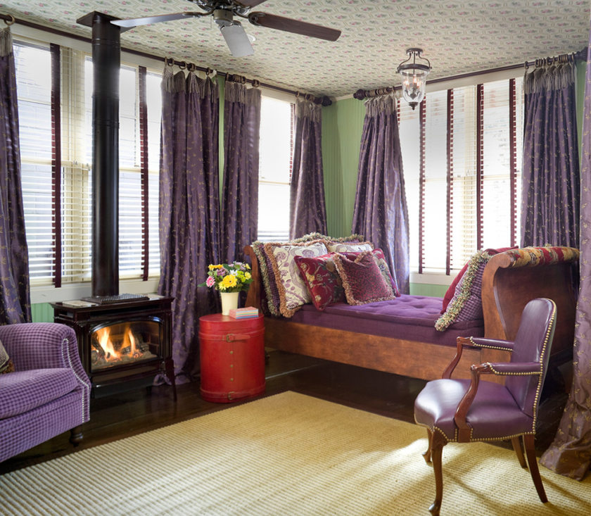 Сиреневые шторы чаще всего используются в аранжировках белого и бежевого цвета. Они красиво подчеркивают оконные рамы и привносят контраст в помещение. Еще более выраженный эффект достигается сочетанием сиреневого с насыщенными цветами: