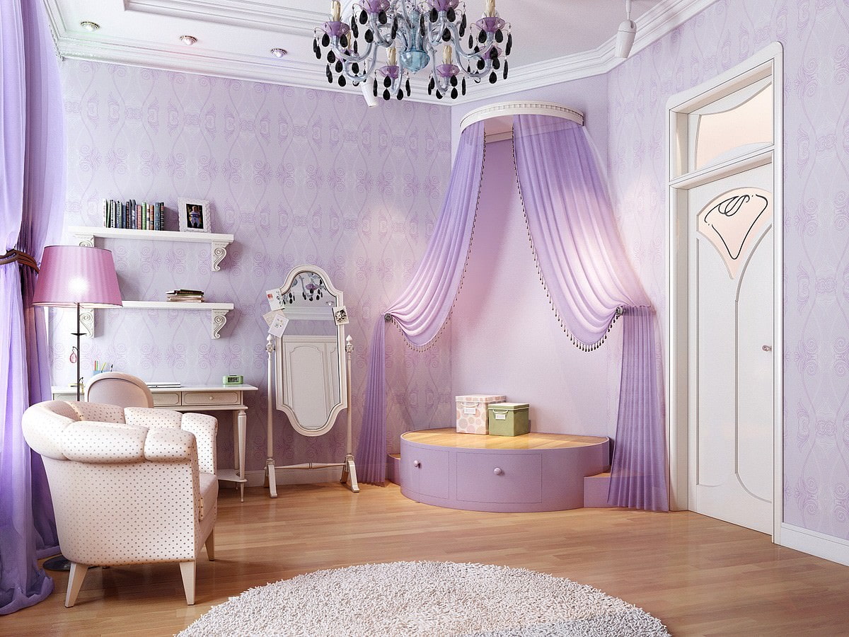 Интересным решением для небольших квартир могут стать шторы, которые будут зонировать интерьер. Например, в однокомнатной квартире сиреневые занавески могут разделить спальню от гостиной. Это также интересное решение в квартирах, где кухня и зал расположены в одном помещении. Сиреневые прозрачные шторы также можно использовать в качестве самодельного навеса, который идеально подходит, например, в комнате для девочки.