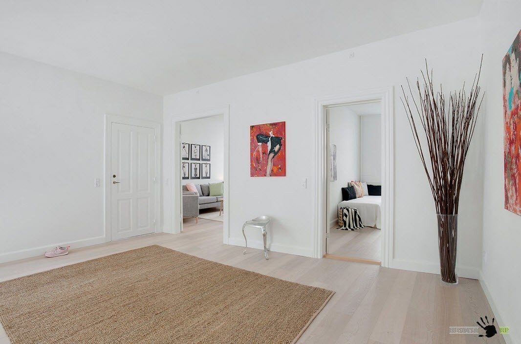 Отличительная черта скандинавского стиля – это, практически в 100% случаев, белоснежная отделка стен и потолка, напольное покрытие в виде ламината, деревянной доски или паркета, чаще всего из светлых пород древесины или ее качественной имитации. Яркие и броские предметы декора и мебель небольших размеров на фоне белоснежных стен, также является одним из основных приемов стилистики северной Европы.