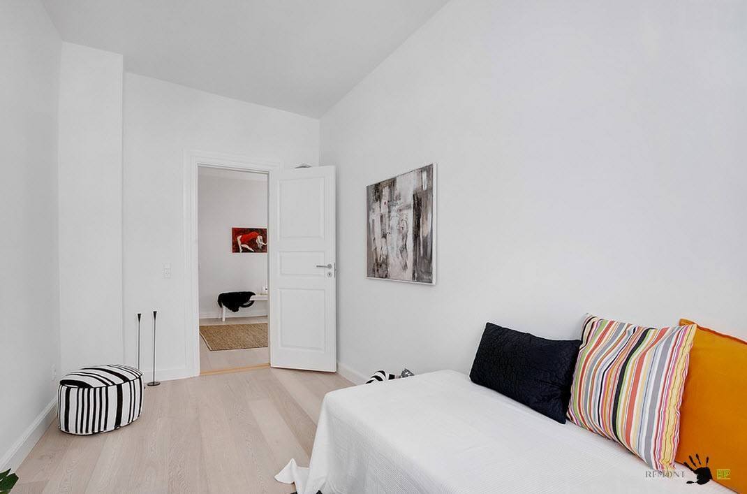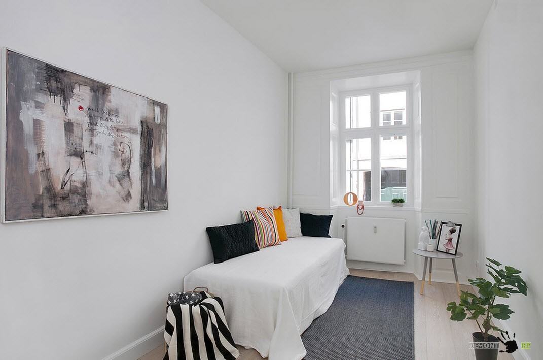 Далее рассмотрим личные комнаты и заглянем в небольшую спальню, рассчитанную на одного человека. Неудивительно, что и эта небольшая и достаточно узкая комната имеет белоснежную отделку и обставлена весьма скромно. В качестве контрастных акцентов проще всего использовать текстиль. Окна в интерьерах, оформленных в скандинавском стиле, часто вовсе не драпируются, либо для их оформления используется белый полупрозрачный тюль. Значит, для яркости и контраста в текстиле остается оформление спального места и дополнительной меблировки.