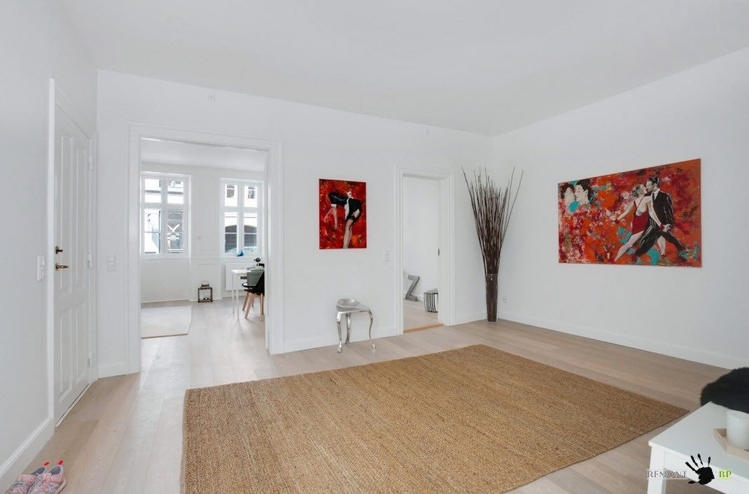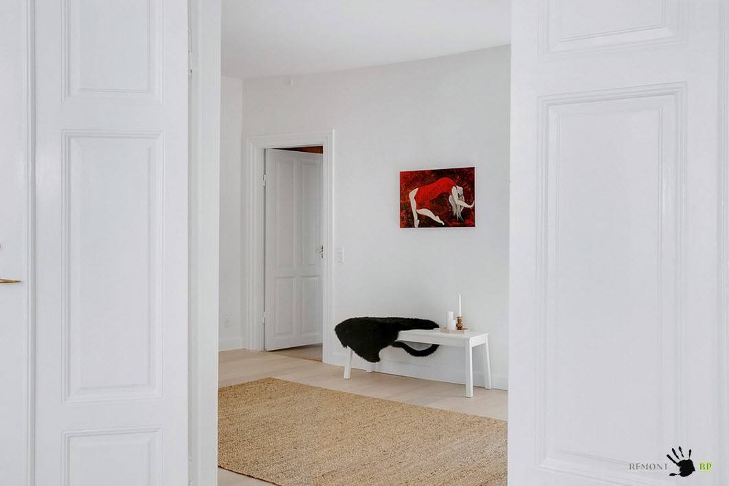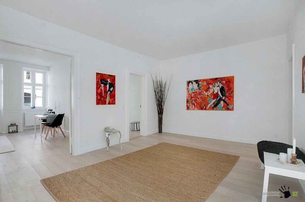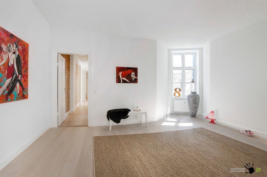 Предлагаем вашему вниманию осмотр помещений одной квартиры, расположенной в столице Дании, в Копенгагене. Для жилплощади с непростой планировкой и комнатами, имеющими асимметричные формы, белоснежная отделка и минималистская обстановка стала находкой, а оригинальный немногочисленный декор позволил привнести в интерьер уникальность и персонализировать его. Начнем нашу фото-экскурсию с просторного холла, который является не только визитной карточкой квартиры, но и связующим помещением для нескольких комнат.