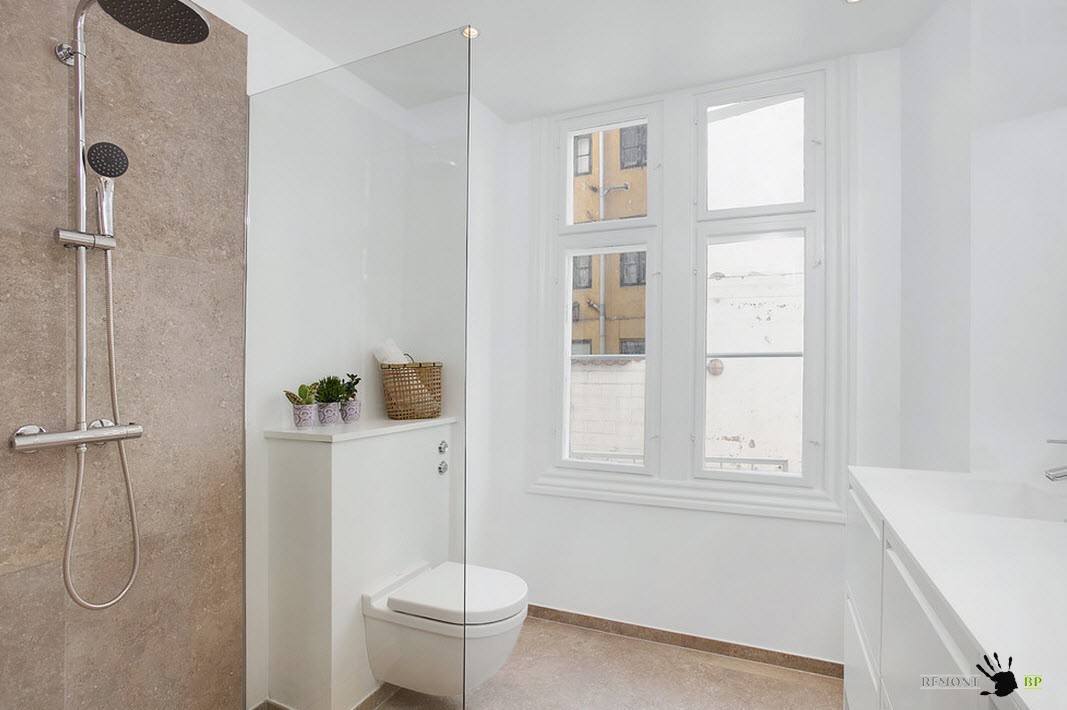 Рядом со спальнями расположена ванная комната, безусловно, с интерьером в белых тонах. Белоснежное исполнение отделки стен и потолка перемежается с облицовкой керамической плиткой в темно-бежевых тонах плоскостей с наиболее высоким уровнем воздействия влаги – на полу и в пространстве душевой кабинки.