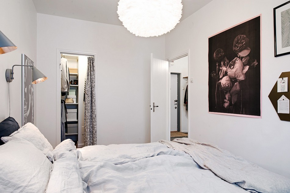 Все пространство первой и самой большой в квартире комнаты отделано с помощью белоснежного тона стен и потолка, а также светлой древесины паркета в качестве напольного покрытия. Белые стены – один из самых распространенных дизайнерских приемов для оформления помещений в скандинавском стиле. Просторные, светлые комнаты, залитые солнечным светом – что еще нужно скандинаву, живущему в непростых климатических условиях.