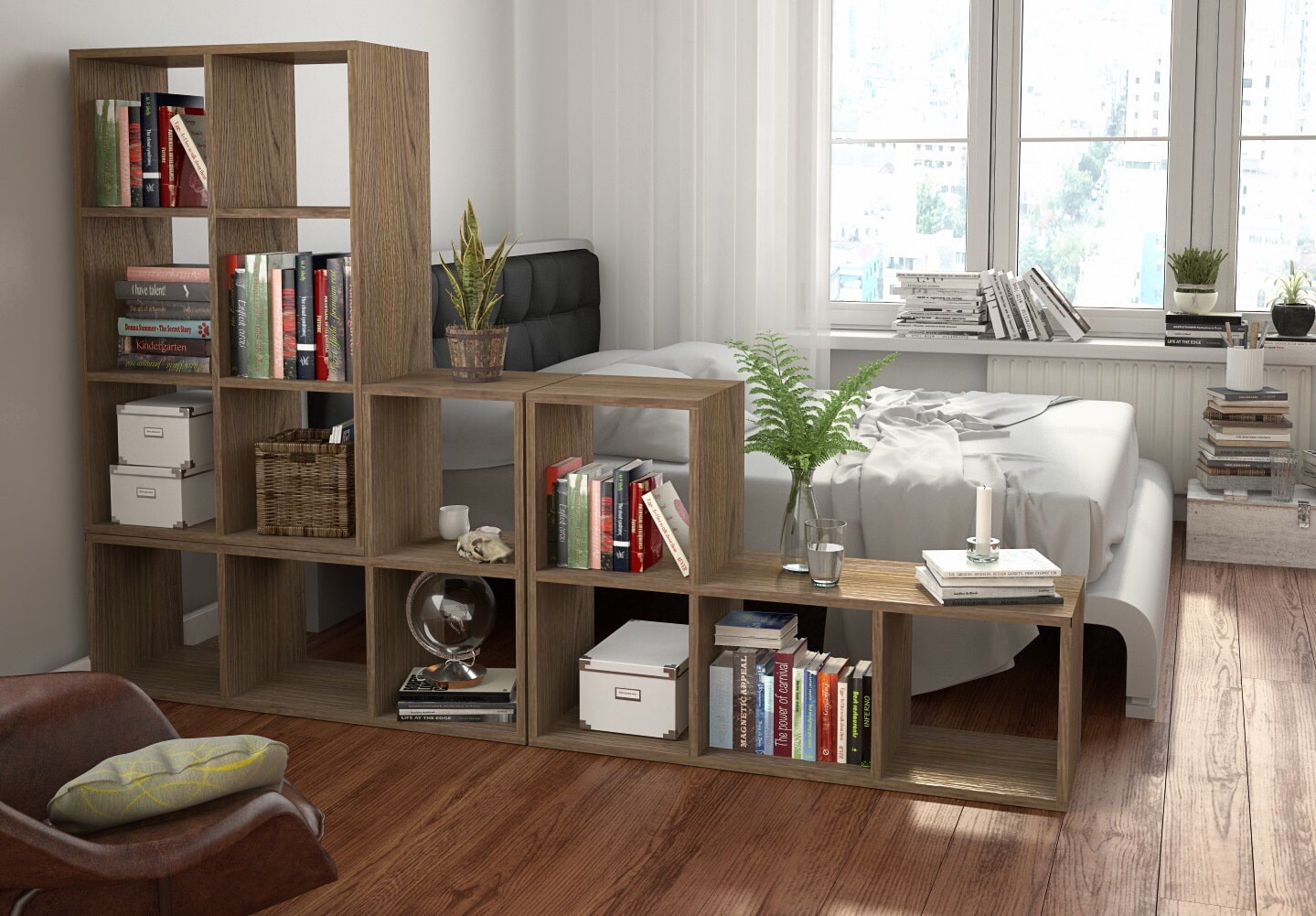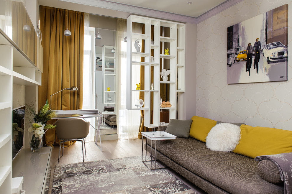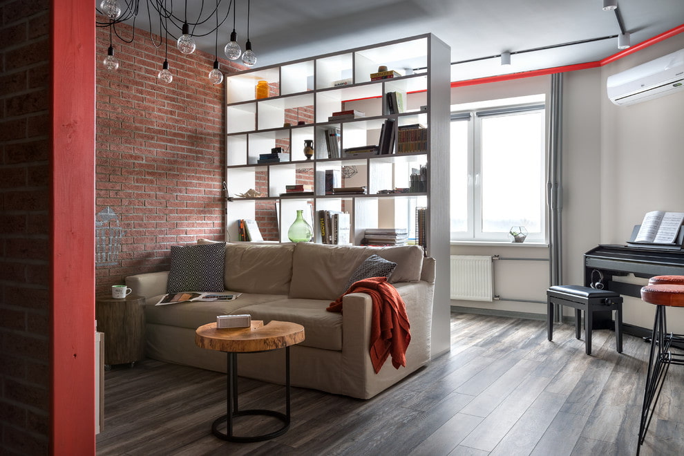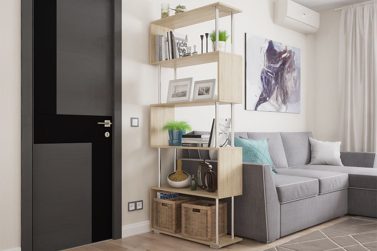 В случае, если стеллаж нужен именно для зонирования помещения, тогда его идеально использовать для квартиры-студии. Удобное мобильное основание такого стеллажа даст возможность с легкостью менять обстановку, при этом не заботясь об интерьерных стандартах. Также стеллаж может быть и временной ширмой, которая будет периодически убираться и собираться. Главное – оснастить его специальными колесиками для быстрого перемещения.