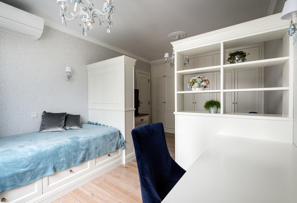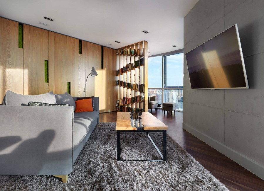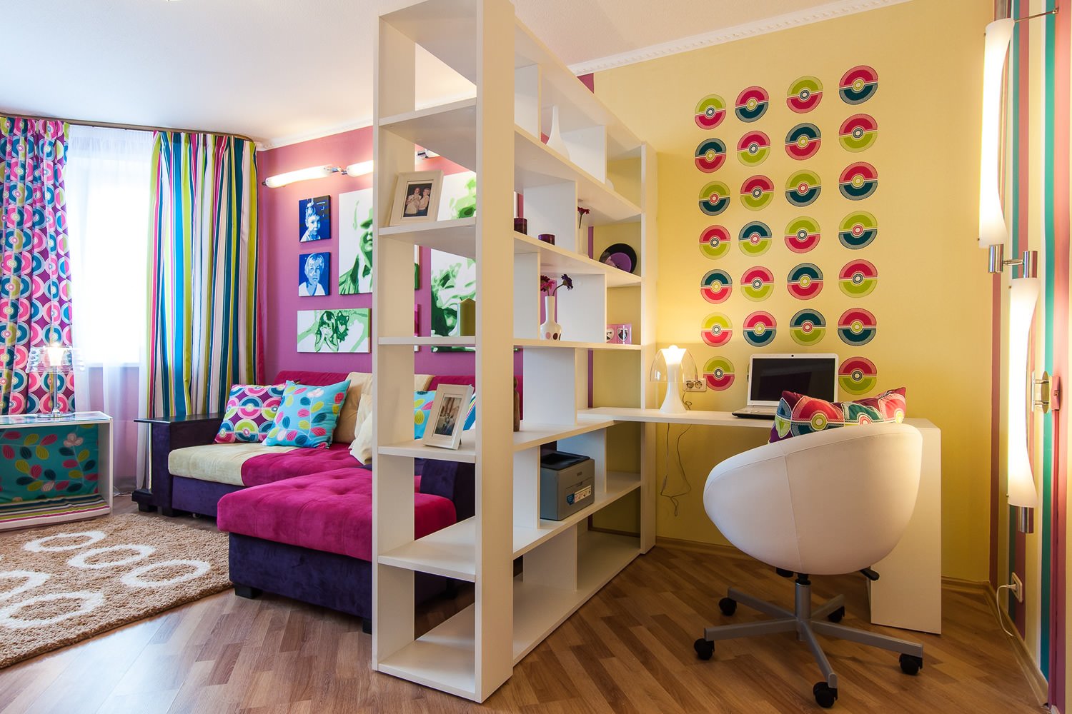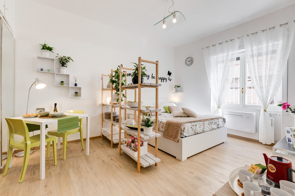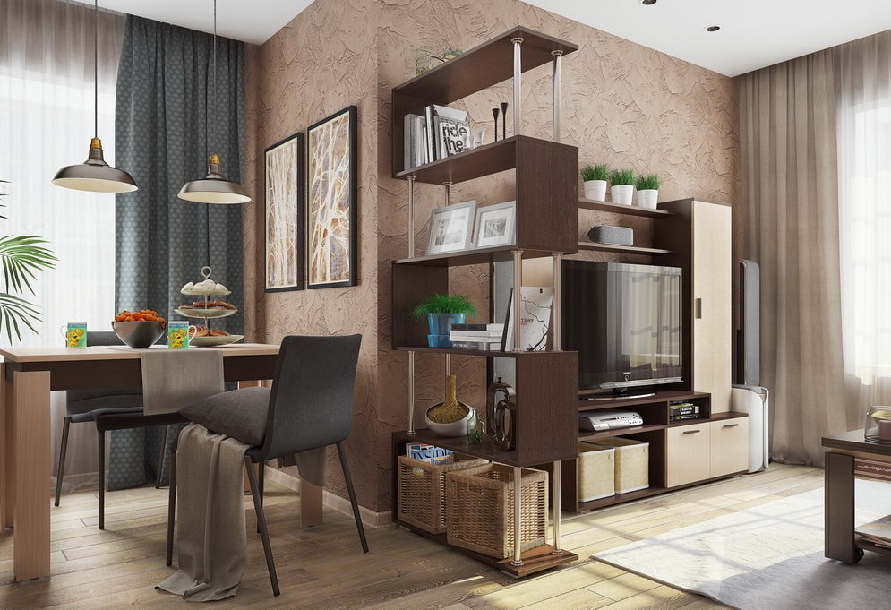 В случае, если стеллаж нужен именно для зонирования помещения, тогда его идеально использовать для квартиры-студии. Удобное мобильное основание такого стеллажа даст возможность с легкостью менять обстановку, при этом не заботясь об интерьерных стандартах. Также стеллаж может быть и временной ширмой, которая будет периодически убираться и собираться. Главное – оснастить его специальными колесиками для быстрого перемещения.