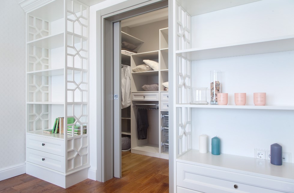 Открытые, свободные полки – это достаточно большой риск скопления пыли. Но, с другой стороны, такую пыль легко убирать при любом виде уборки: хоть сухой, хоть влажной.