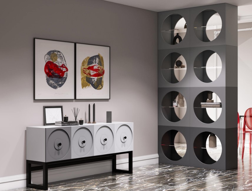 Существует довольно много типов сквозных стеллажей. Они бывают подвесные, встроенные, угловые, цилиндрические, другие. Что касается размещения, то здесь фантазия может быть безграничной. Можно разместить стеллаж классически: он ставится симметрично к другим мебельным объектам. Такой вариант устроит совершенно любой стиль комнаты. Стеллаж также может играть роль зонированного объекта.