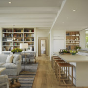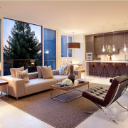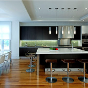 Слияние в одно целое двух разных по исходному смыслу и предназначению помещений сделало неизбежным следование одному правилу – унификации предметов для возможности их использования как в гостиной, так и на кухне. Барная стойка может, к примеру, служить неким дополнением к обеденному столу. А последний, в свою очередь, будет прекрасным местом размещения небольшой винотеки.
