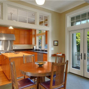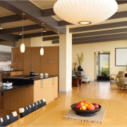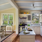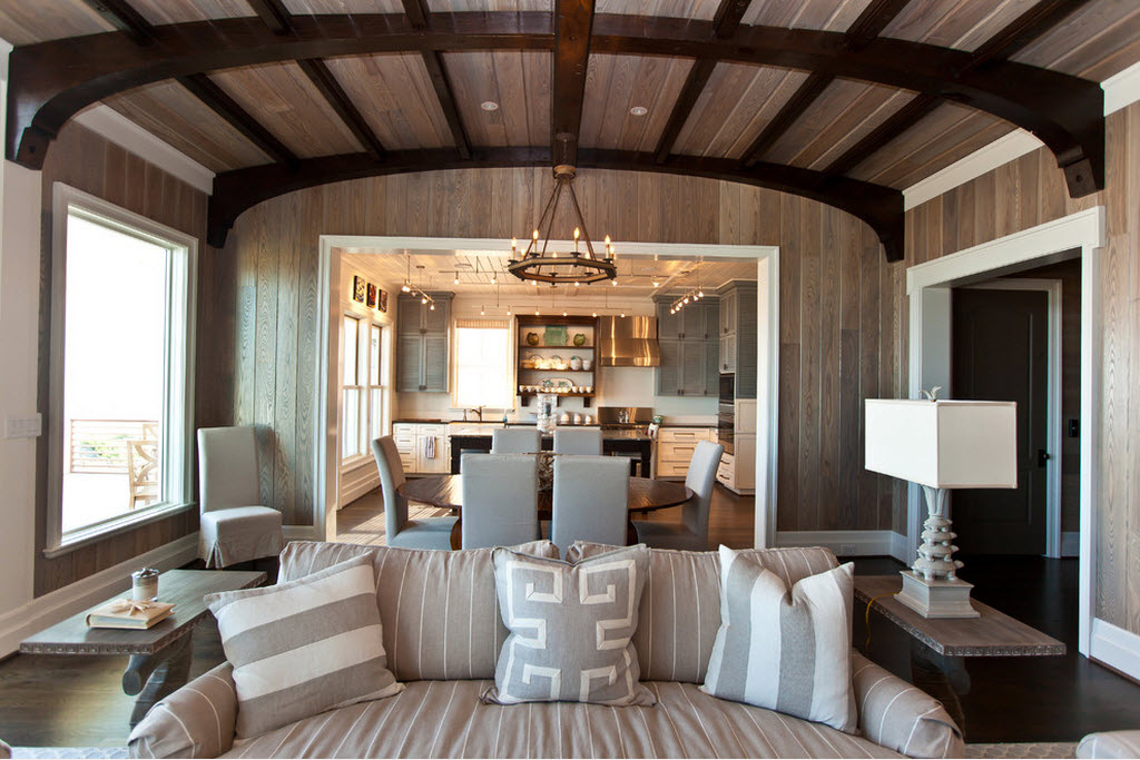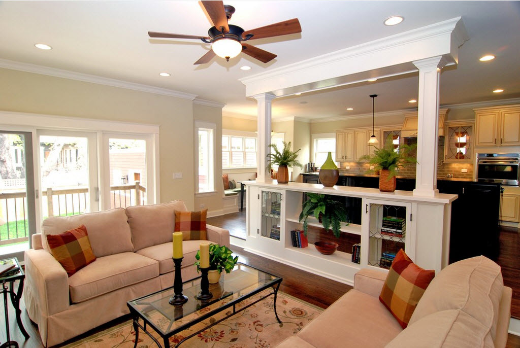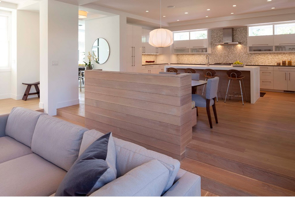 Легкие стилизованные и полупрозрачные перегородки являются оптимальным выбором для тех, кто всё-таки хочет время от времени закрывать область кухни от посторонних глаз. Такие заслоны могут складываться гармошкой или просто сдвигаться при необходимости. Небольшой перепад высоты потолка тоже может помочь зонированию.