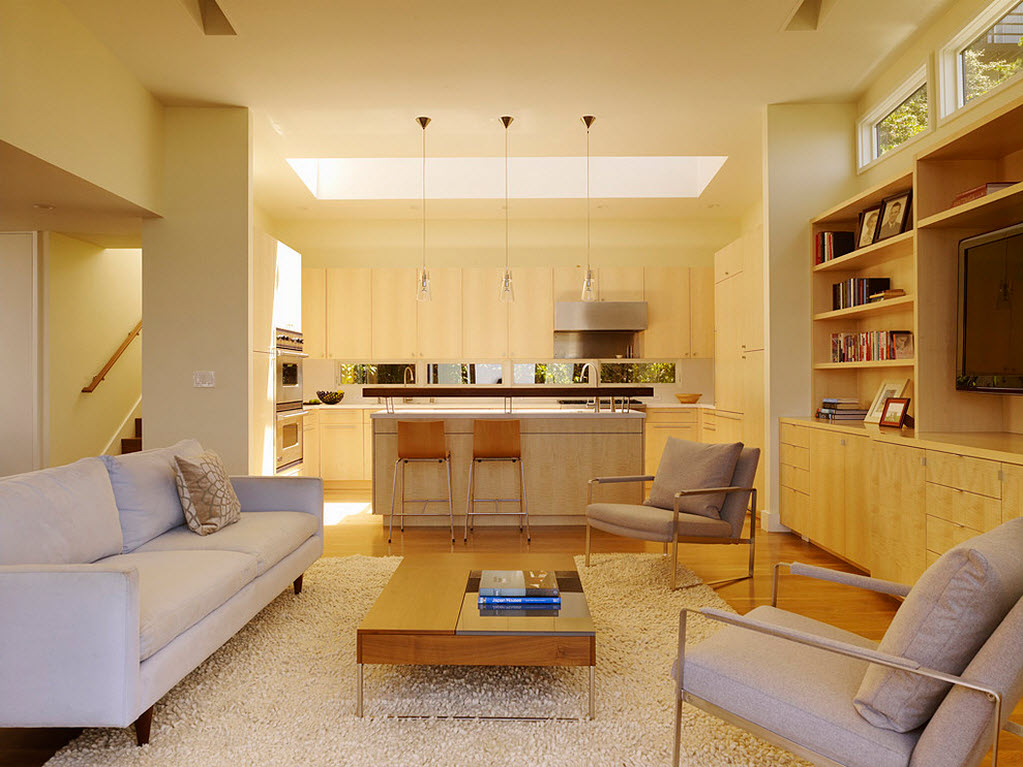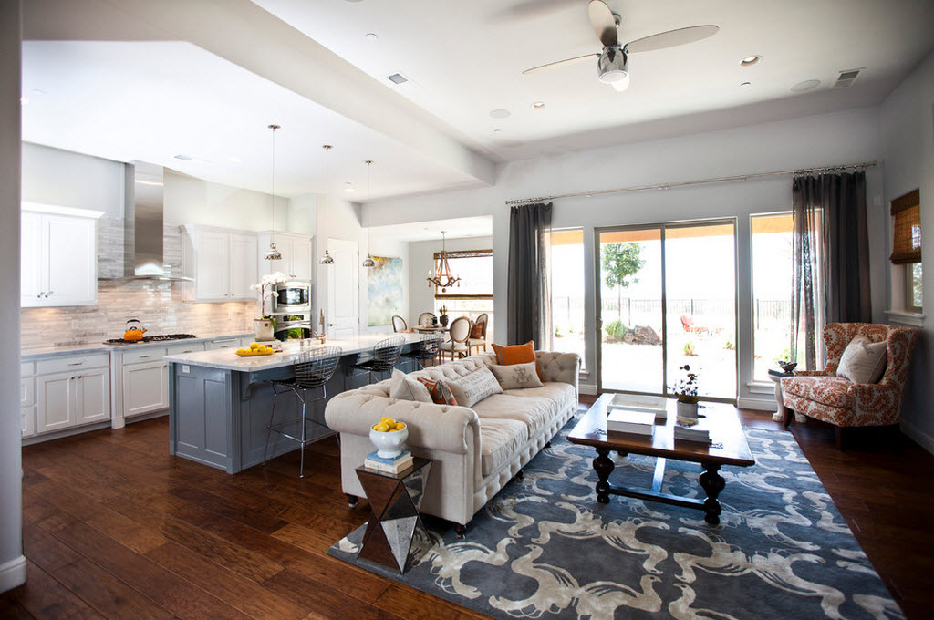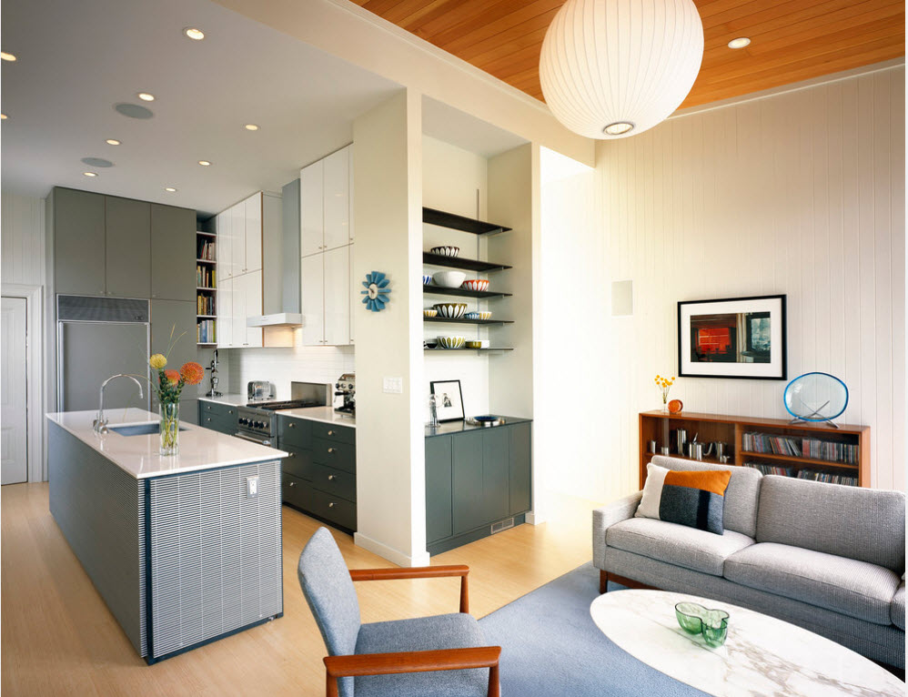 Надо сказать, последний вариант – это самое оптимальное решение при недостатке квадратных метров. Часто к нему прибегают в целях увеличения именно гостиной, а не кухни: так или иначе, совмещенные комнаты превращаются в удобное свободное пространство.