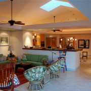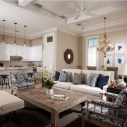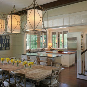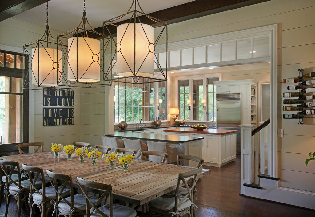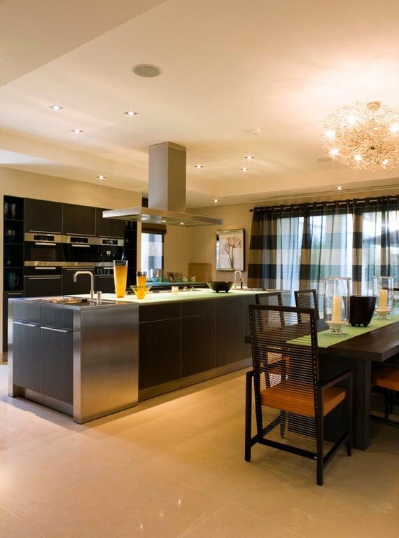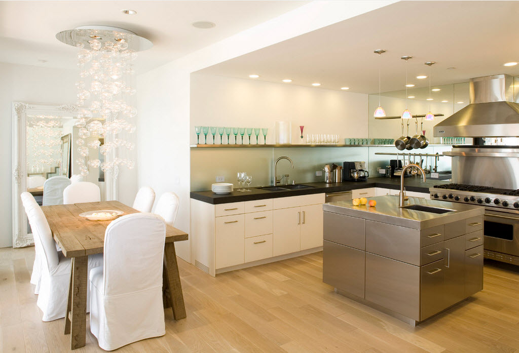 При планировании кухни-гостиной особое внимание следует уделить освещению. Ведь именно свет играет значимую роль в делении функциональных зон. И здесь очень важно соблюдать правильный баланс между яркими и более мягкими световыми переходами. Так, на кухне очень изысканно будет смотреться необычная изящная люстра или гламурная лампа, излучающая яркий свет, а в локальных местах над столом, барной стойкой, плитой, мойкой, рабочей поверхностью – точечное освещение, обеспечивающее плавный переход в приятное мягкое освещение.