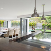 Ещё существует приём разделения через сооружение некоего разграничивающего острова, который может быть представлен либо замкнутой в кольцо и вытянутой барной стойкой, либо самим обеденным столом. Форма столешницы тут обычно выполняется по лекалу на заказ для наиболее естественного слияния с прочей обстановкой, размерами и соотношением сторон гостиной-кухни.