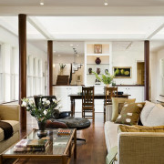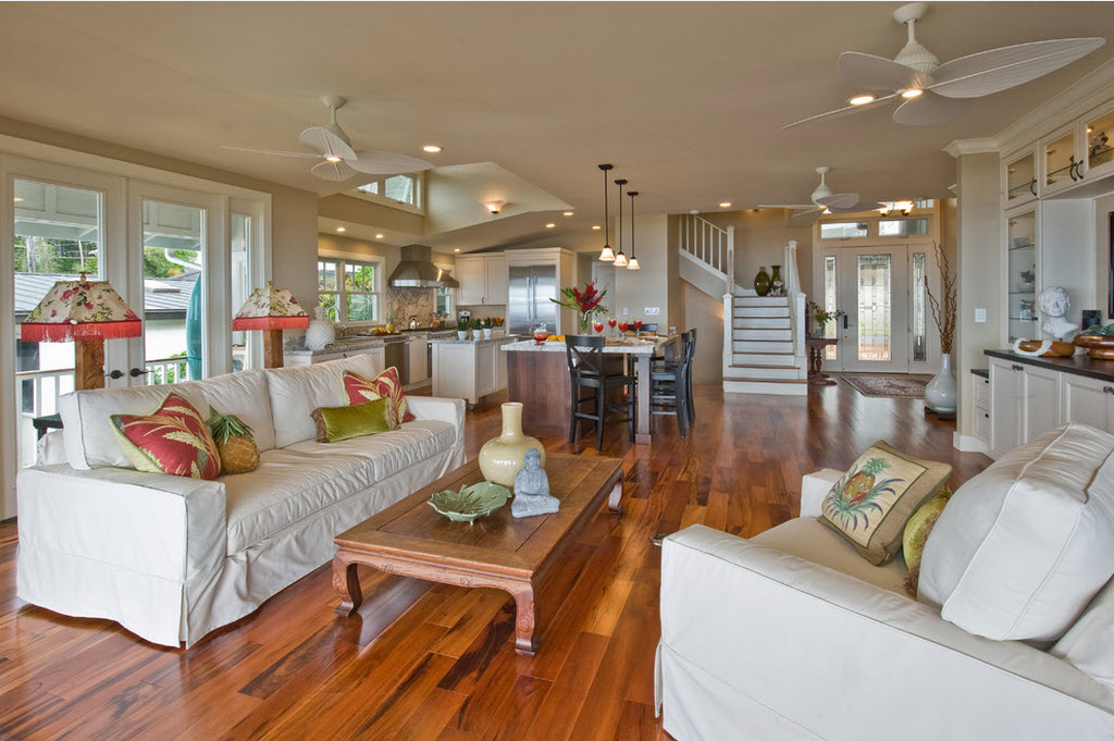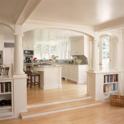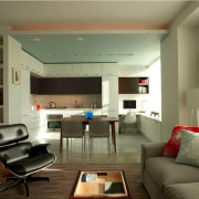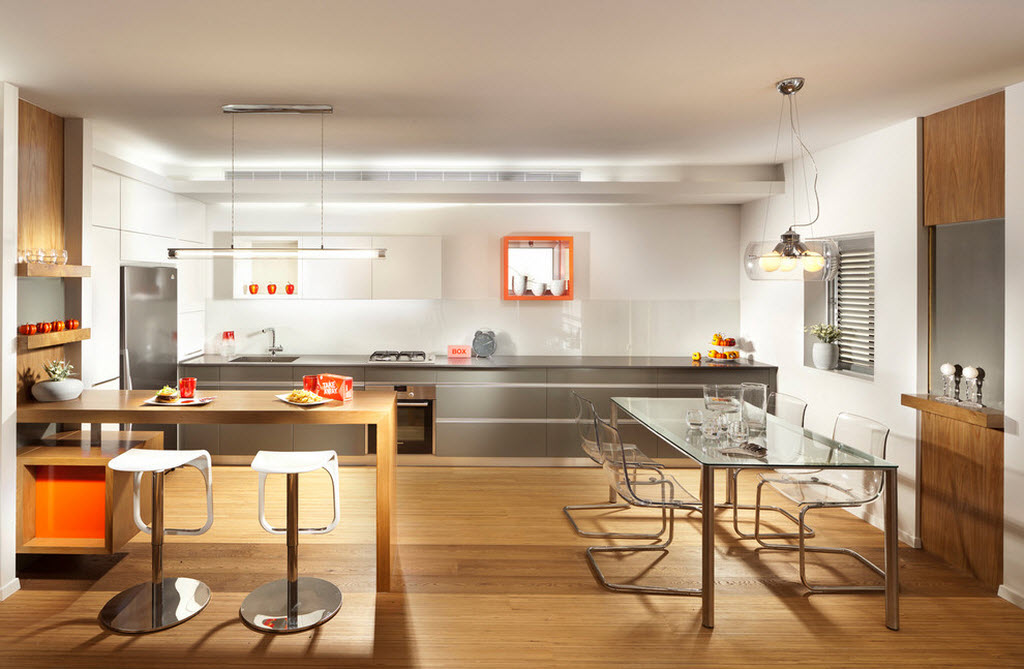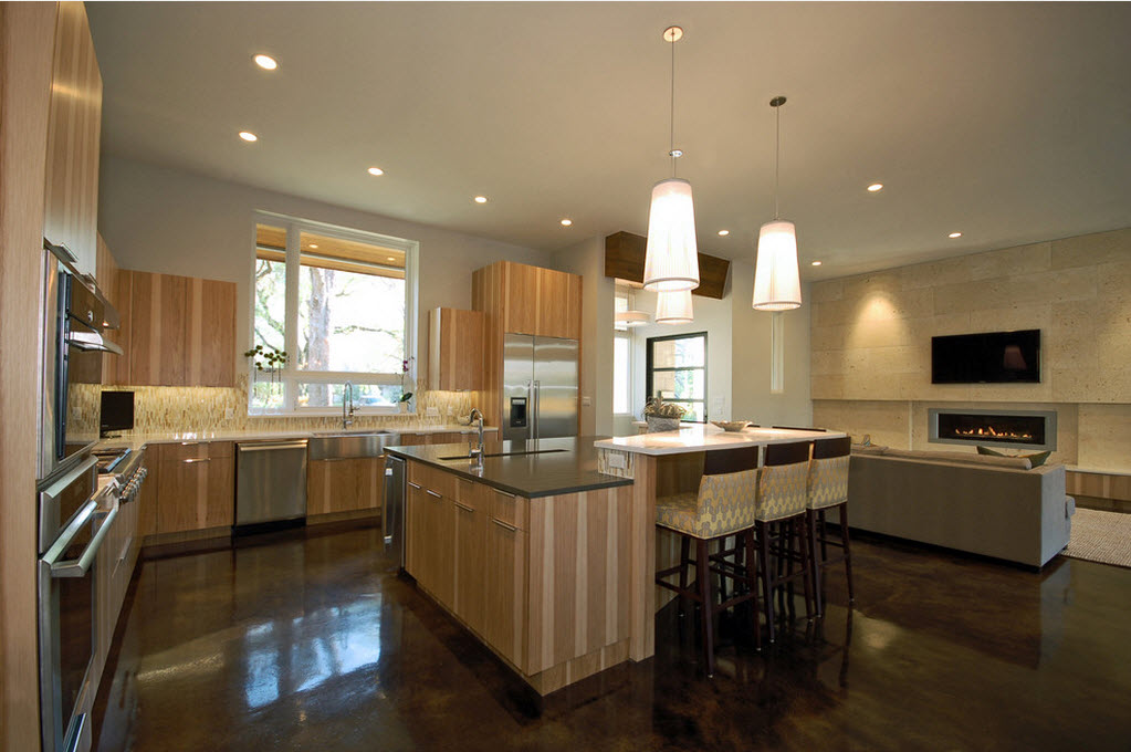 Также популярен и двухуровневый пол. Зона кухни может быть приподнята или немного заглублена по отношению к уровню всей гостиной. Приподнятый на полступени подиум служит хорошим прикрытием для всех кухонных коммуникаций. А если сделать наоборот, то будет проще следить за чистотой и порядком. В любом случае здесь важно, чтобы изначальная высота потолков была достаточной.