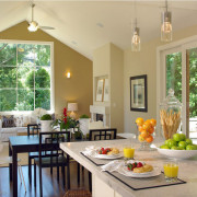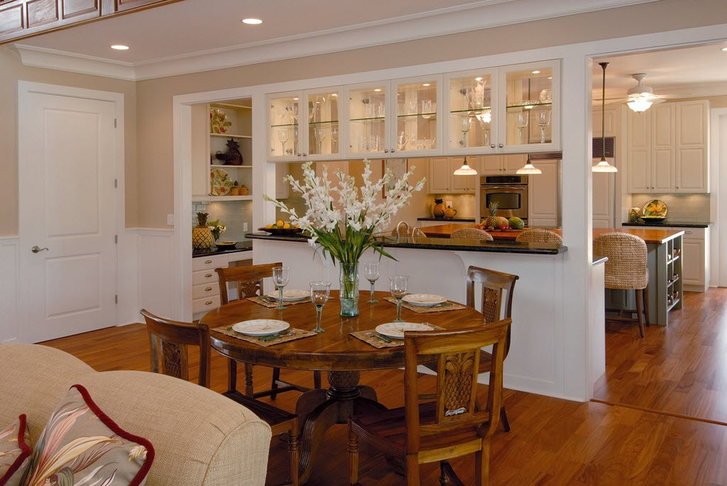 Неоспоримое преимущество слияния кухни с гостиной – расширение площади для общих встреч домочадцев за обеденным столом. Теперь в гостиной намного больше дневного света за счёт кухонного окна, а хозяйка может свободно общаться с домашними, гостями, постоянно находясь в поле зрения, при этом без лишних хождений сменять блюда на столе.