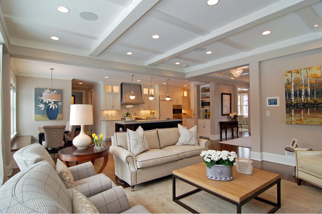 К гостиной требования более лояльны – здесь можно пофантазировать и все оформить на свой вкус. Но как показывает опыт, наиболее оптимальный вариант – это точечное подсвечивание по периметру одноуровневого или многоуровневого потолка.