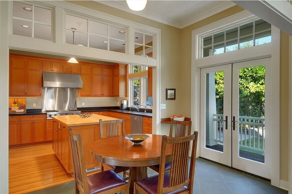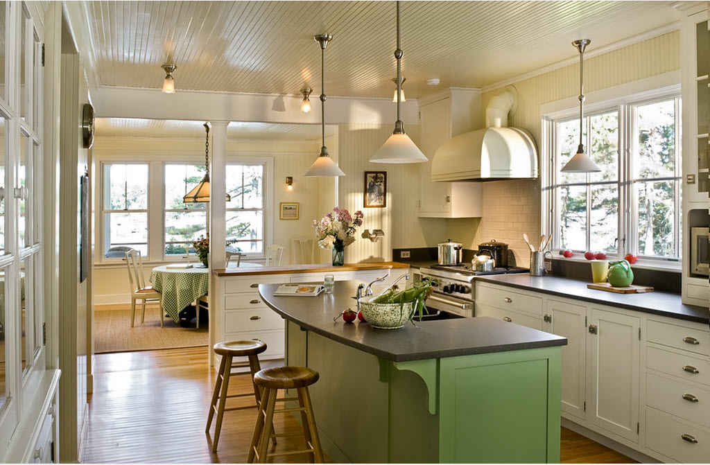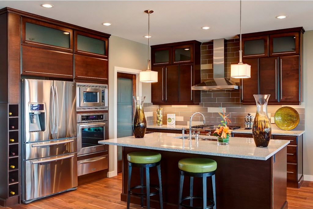 Когда есть намерение подчеркнуть некую обособленность места для приготовления пищи, то на помощь придут контрастные цветовые решения, мебель из разных материалов, сочетания разных стилей.