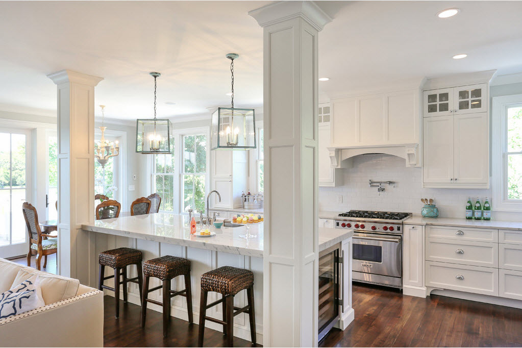 Основной и часто применяемый метод – возведение барной стойки. В качестве последней может выступать частично оставленная перегородка, которая прежде отделяла кухонный объём. Оформляют такой своеобразный барьер деревом, облицовочным камнем в комбинации с фрагментами из пластика.