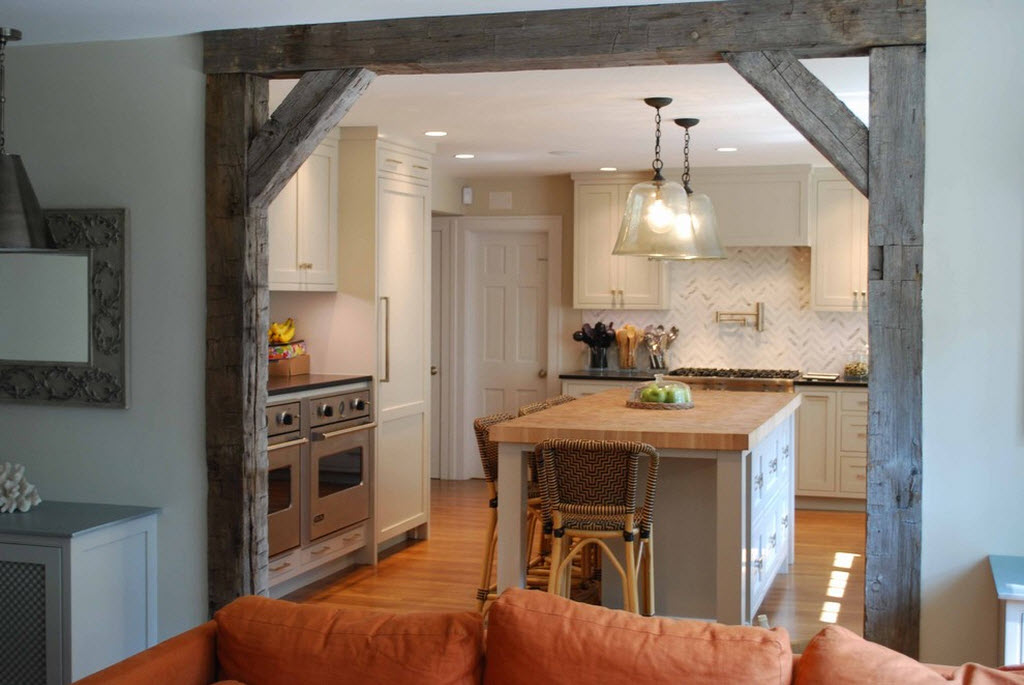 Подбирая вытяжку, отдавайте предпочтение моделям, оснащенным стандартной функцией воздухоотвода. Не стоит покупать конструкции с режимом рециркуляции, когда отфильтрованный воздух обратно попадает в совмещенную комнату. Громоздкий воздуховод можно спрятать за фасадом навесного шкафа, прикрыть гипсокартоном, имитирующим декоративную балку, либо оформить его контуры фактурным изящным орнаментом.