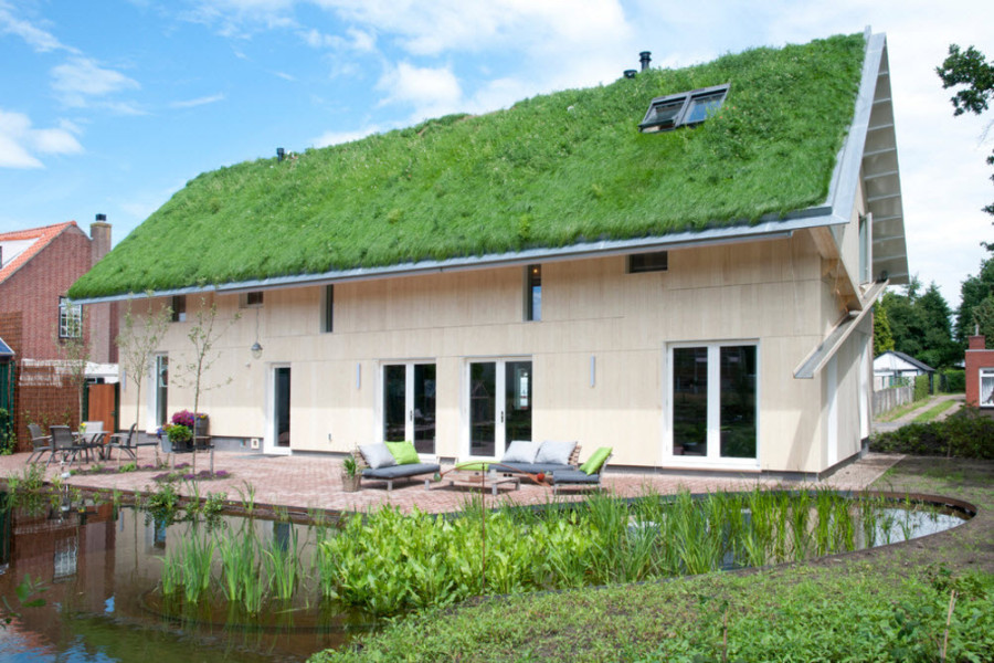 Современная архитектура стремится к активному использованию экологически чистых материалов и технологий, которые не только способны не оказывать вредное влияние на человека и природу, но и сохранять окружающую среду. В мегаполисах такие строения помогают, помимо прочего, очищать и улучшать состояние окружающей среды. Например, так называемая инверсионная кровля или «зеленая крыша» набирает популярность в разных уголках нашей планеты. Газонная трава, садовые цветы и даже мелкий кустарник на крыше не только способствует созданию отличной звукоизоляции, защищает здание от вредного воздействия различных климатических факторов, но и придает всему образу здания совершенно неповторимый, уникальный внешний вид. Именно с таким частным домом мы сможем ознакомиться в данной публикации.