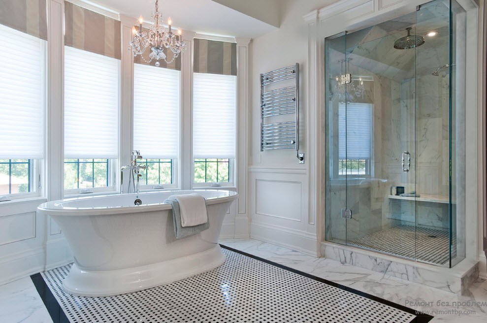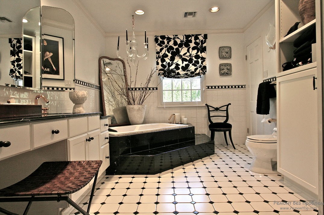 Что же, в такой ситуации открываются широкие возможности декорирования помещения. Владельцам таких ванных комнат остается только позавидовать, тем более, в черно-белом сочетании такие хоромы будут выглядеть просто восхитительно.
