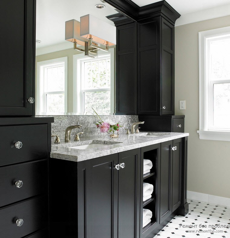 - размещать зеркало, а также зеркальные шкафчики таким образом, чтобы в них не отражалась черная стена;