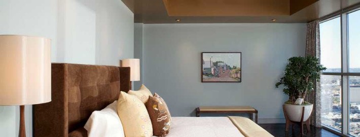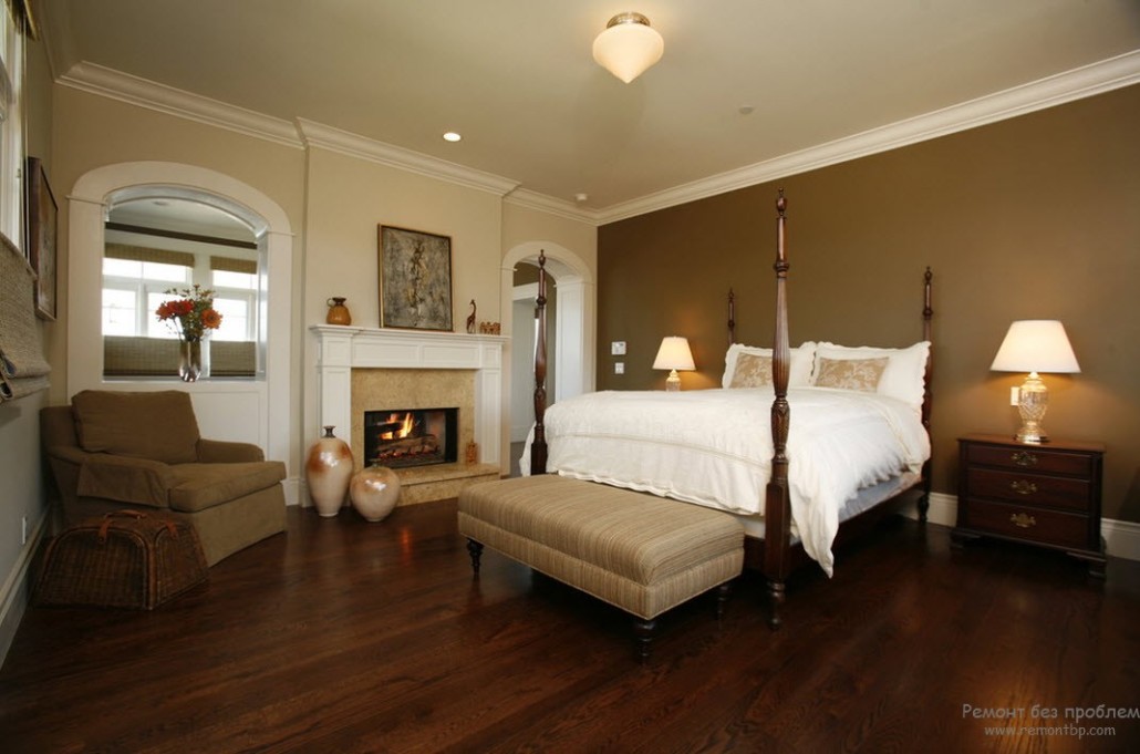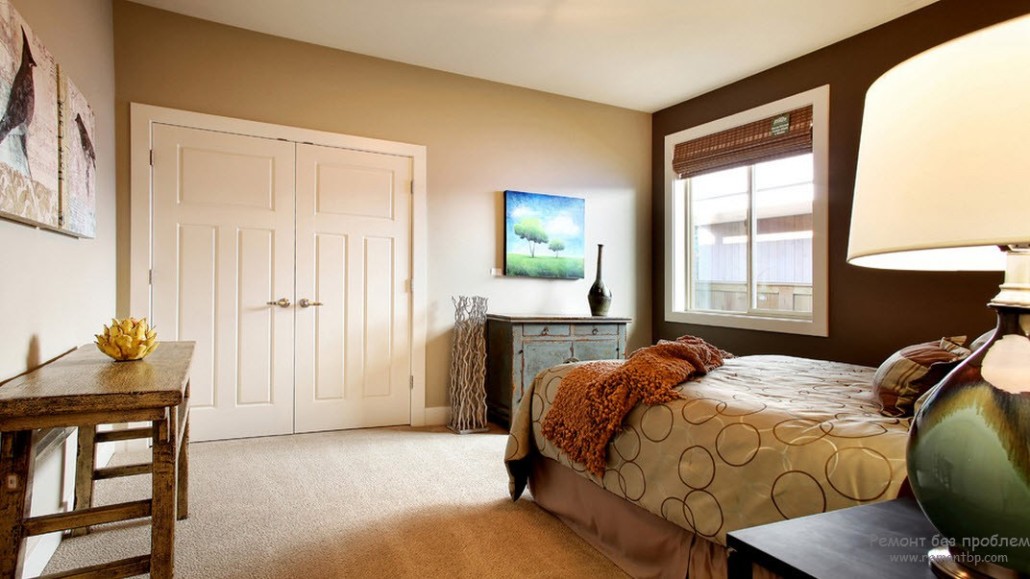 Для интерьера спальни лучше всего сочетать коричневый цвет с постельными тонами. Тогда комната будет выглядеть более мягко. В отличие от сочетаний с белым, пастельные интерьеры теплее.