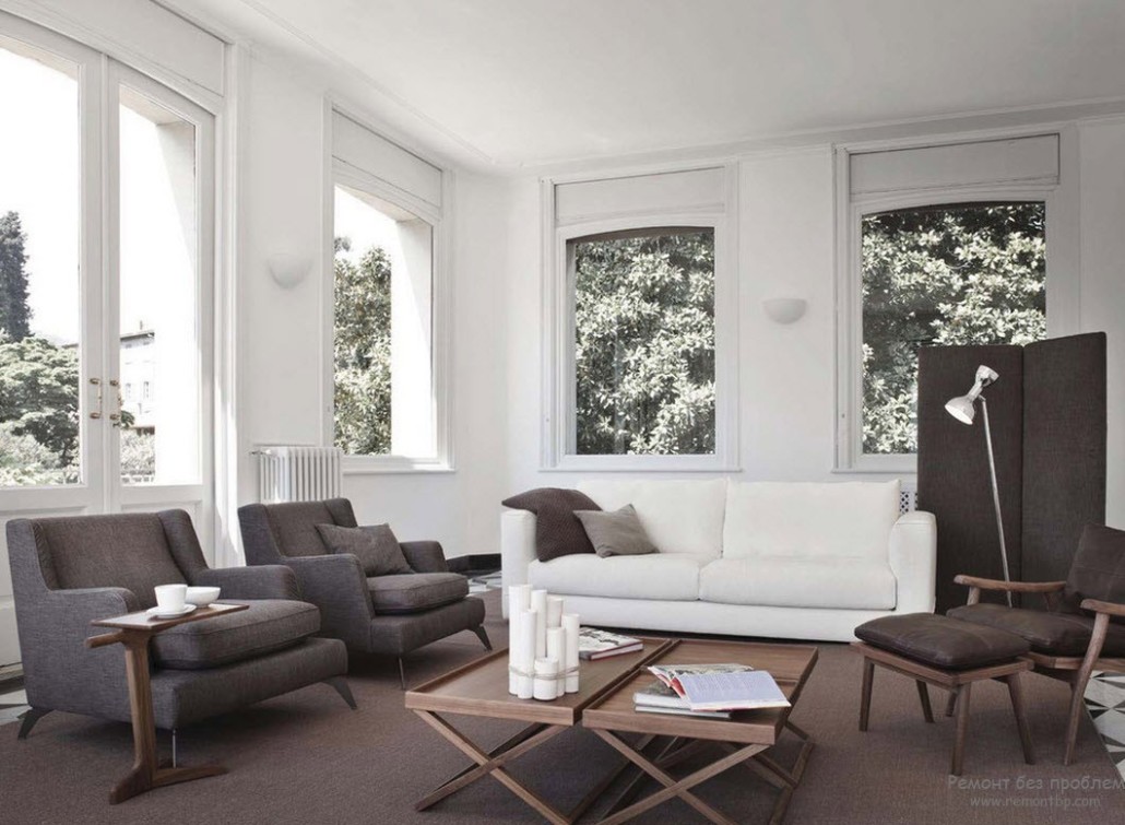 Нейтральность белого позволяет использовать его в любом месте, удачным вариантом будет акцент в затемненном коричневом углу, например, в виде торшера или декора.