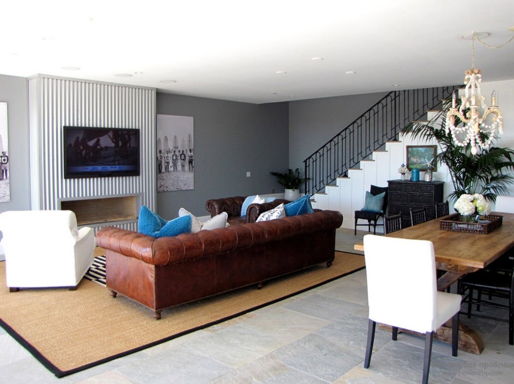 Коричнево-голубые интерьеры выглядят слегка прохладно, даже если голубого цвета не очень много. Нейтральность коричневого выступает в данном союзе даже как усилитель холодного ощущения. Но это не минус для интерьера, многие любят именно такую атмосферу, здесь чувствуется мощь земли, твердой и надежной.