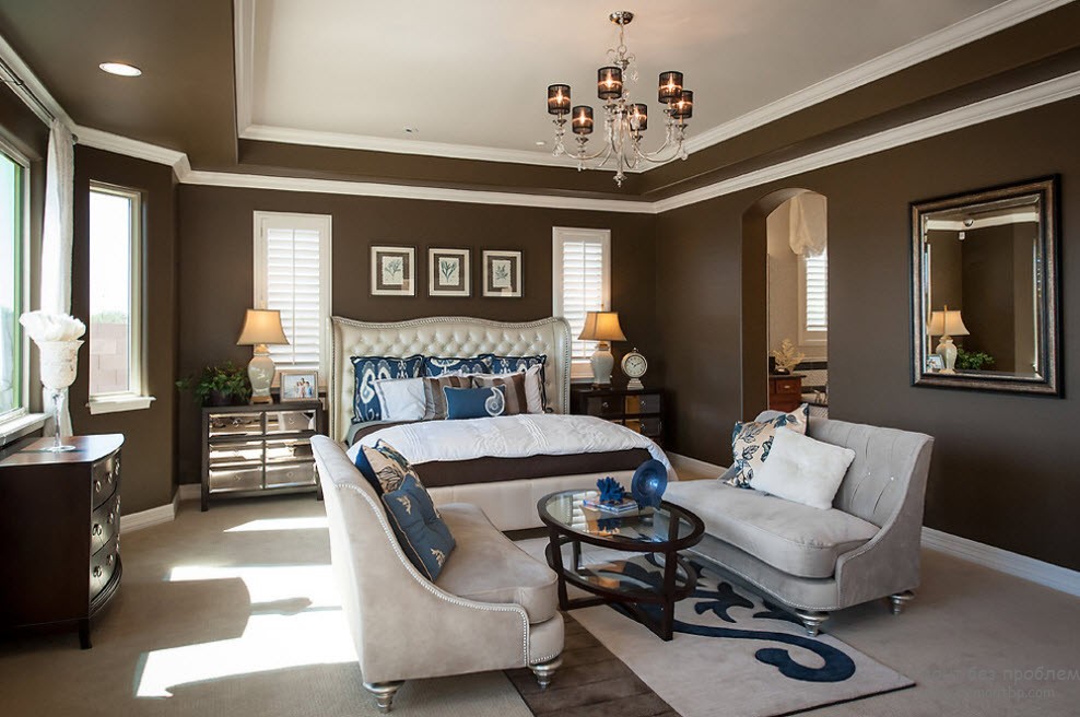 Выбирая этот цвет для своих комнат, будьте осторожны. Если комната маленькая, то не стоит перегружать ее данным цветом, иначе помещение станет еще меньше и будет выглядеть мрачно. Во избежание этого нюанса, применяется сочетание коричневого с другими цветами, наиболее часто с белым.