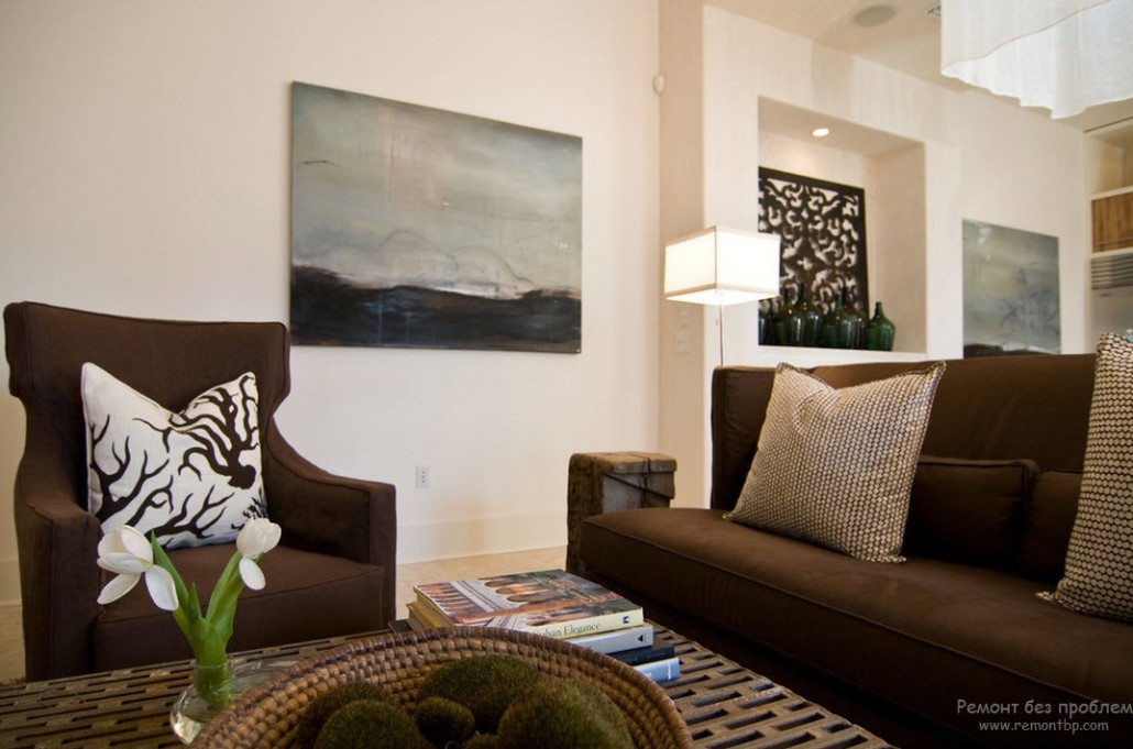 В отношении гостиной тоже нередко выбирается пастельная палитра в сочетании с коричневым. То есть что мы получаем? Коричневый интерьер – это атмосфера надежности и защищенности. Но чтобы избежать мрачности или давящего ощущения, разбавим обстановку мягкими пастельными нотами. К тому же не всем людям нравятся темные цвета, а среди пастельных (особенно в качестве фона) они будут чувствовать себя более комфортно. Ведь все-таки гостиная предназначается в первую очередь для гостей.