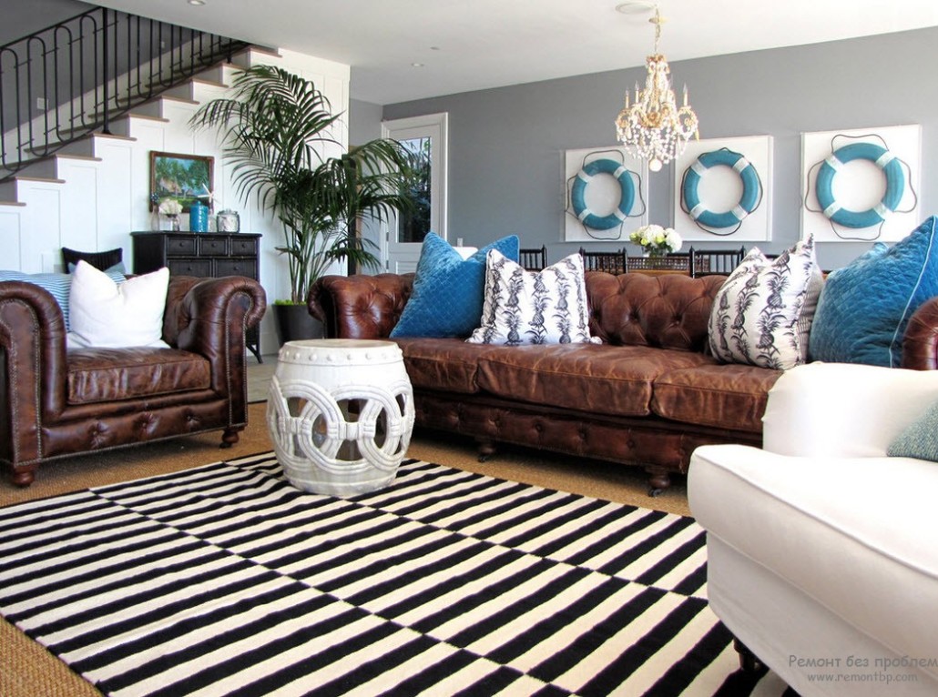 Очень часто используется принт на обивке мебели, шторах и так далее, он дает некий переход между этими цветами, и обобщет их в одну картину.