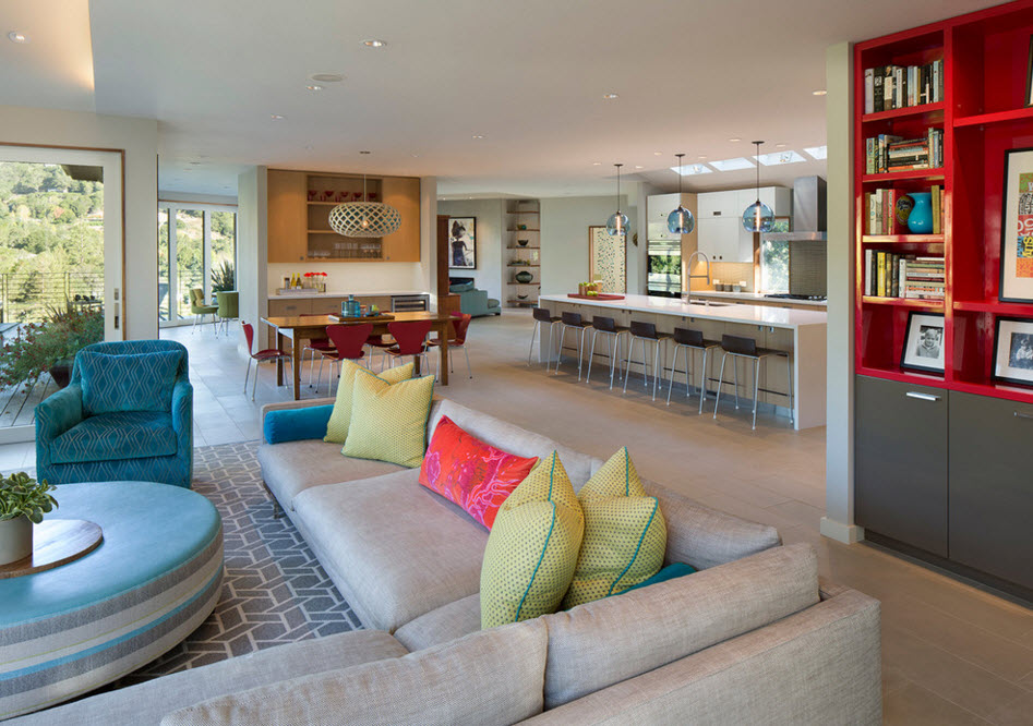 Начнем осмотр интерьера первого этажа частного дома с яркой и солнечной гостиной. Большие окна и светлая отделка стен обеспечивают в помещении максимальное количество солнечного света, создавая легкий и непринужденный образ помещения. За яркость и колоритность в гостиной «отвечают» предметы мебели и декора. Планировка мебели в зоне отдыха размещена по принципу колодца – вокруг одного элемента (в нашем случае – круглого столика-пуфа с мягкой обивкой) выстраиваются остальные предметы меблировки – диваны, кресла, стулья, подставки. Комбинаторика ярких оттенков, их дозированное использование и повторение в разных предметах интерьера, позволило создать позитивный, по-летнему яркий образ гостиной. Немалую роль в создании такого нетривиального дизайна сыграли системы хранения – и стеллаж с алыми глянцевыми поверхностями и матовый комод горчичного цвета невероятно органично были интегрированы в интерьер зоны отдыха.