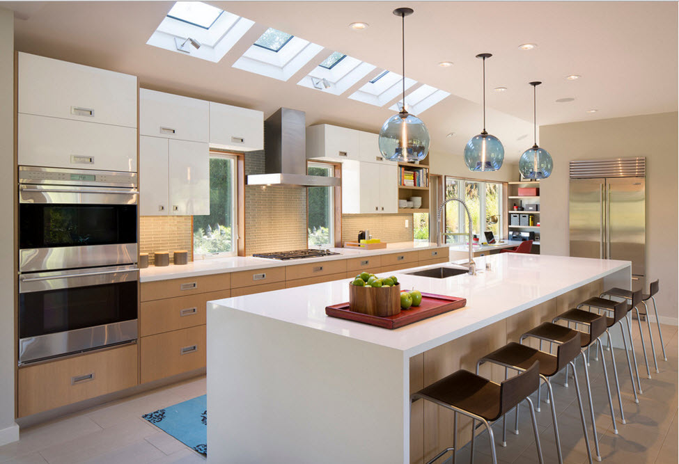 Несмотря на обилие естественного освещения, исходящего из нескольких окон (в том числе и на потолке), в кухонном сегменте активно использовалась интеграция осветительных приборов – это не только встроенная подсветка под верхним рядом шкафов и потолка над островом, но и подвесные светильники. Голубые стеклянные плафоны над кухонным островом, выступающие, помимо прочего, в качестве декоративных элементов отлично гармонируют с ковровым покрытием кухонной зона.