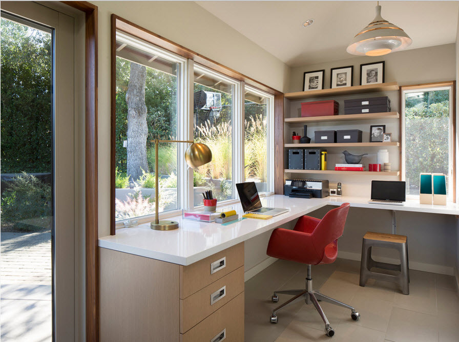 Для еще одного домашнего мини-офиса отведена отдельная комната. В этом интерьере строгость, симметрия и лаконичность поставлены во главу угла – только правильные формы, простые и строгие линии. Небольшое пространство заполнено светом, поэтому применение меблировки темных тонов стало не просто возможным, а позволило создать определенный характер помещения – серьезный настрой на трудовую деятельность сквозит в каждом элементе дизайна.