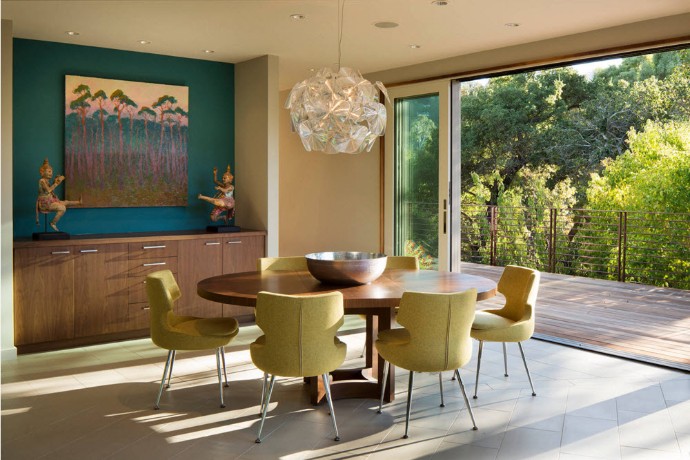 Возле гостиной с камином расположилась еще одна интересная зона – столовая, которую можно использовать и в качестве зала для переговоров. Вместительный круглый стол с красивым природным рисунком древесины и удобные стулья-кресла песочно-горчичного цвета создали невероятно органичный союз. У акцентной стены, оформленной в красивом изумрудном тоне, декорированной в восточном стиле, расположилась вместительная система хранения, исполненная из того же материала, что и обеденный стол. Завершает образ оригинального помещения подвесная люстра с необычным дизайном. Из этого функционального сегмента жилища есть выход на открытую террасу, где на деревянном помосте расположилась еще одна зона отдыха и коротких трапез.