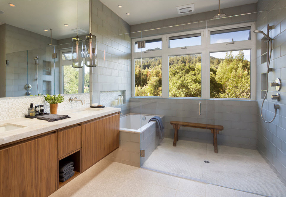 В частном доме с «солнечным» дизайном даже утилитарные помещения залиты светом. В ванной комнате светло и просторно – не только благодаря большим окнам и светлой отделке всех поверхностей, но и отражению солнечного света от стеклянных и зеркальных поверхностей. Эргономичное расположение предметов сантехники и систем хранения, позволило создать все необходимые условия для проведения водных процедур, сохранив при этом простор и свободу передвижения в утилитарном пространстве.