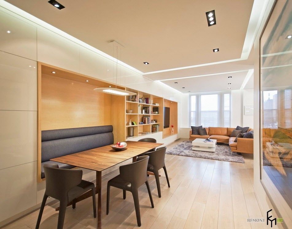 А это уже пример обеденного стола из светлой породы древесины, который задал тон всей обстановке гостиной в теплых, бежевых тонах.