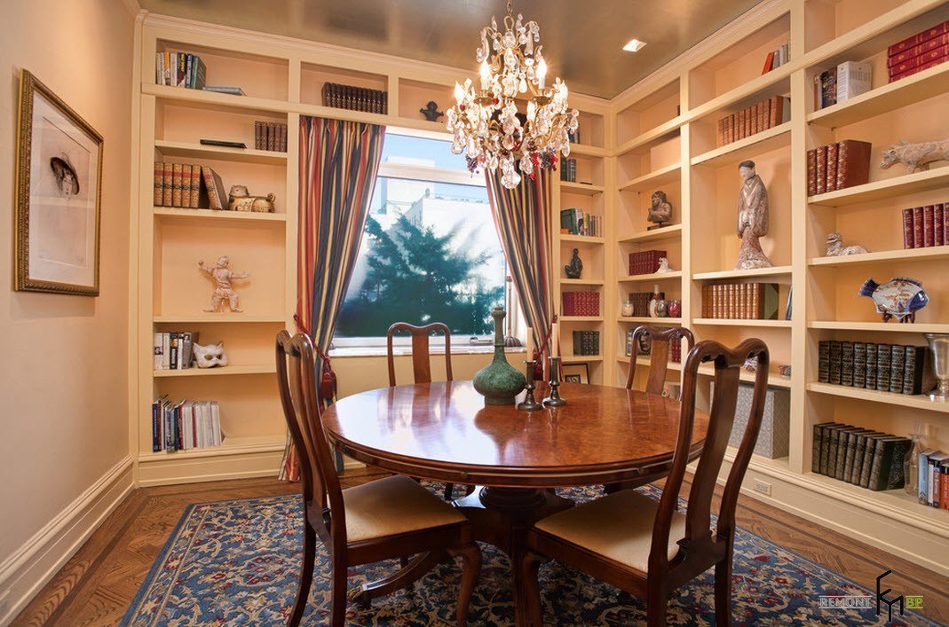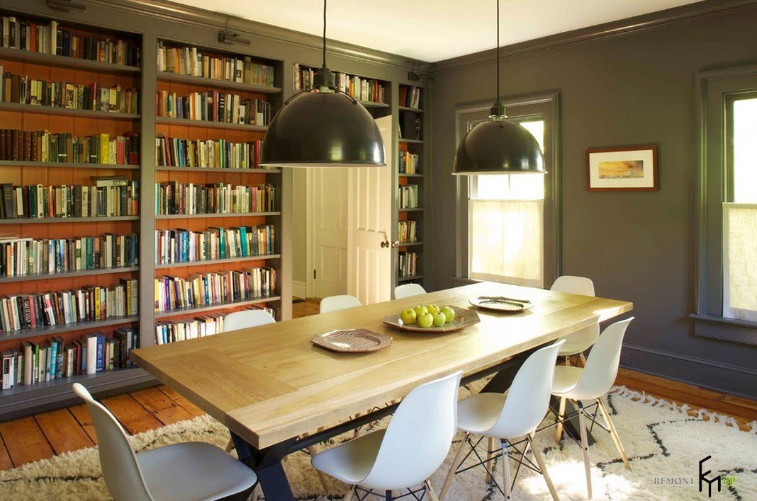Логично, что домовладельцы, у которых есть возможность выделить под столовую отдельное помещение, хотели бы использовать доступное пространство рационально и занять, по крайней мере, стены комнаты, установив книжные стеллажи. В итоге получается нечто среднее между библиотекой и столовой, которую можно использовать и в качестве кабинета по мере необходимости.