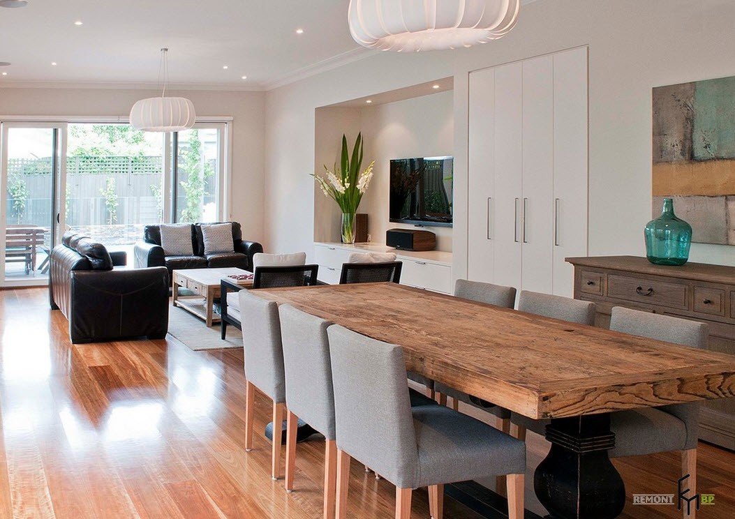 Стол, изготовленный из древесины, неокрашенной, но отполированной, вскрытой лаком, иногда в нарочито небрежной манере, с налетом брутальности в отделке стал хитом для организации обеденной зоны в современном интерьере. Гостиная, столовая или любая другая комната, в которой будет находиться обеденная группа, оформленные в современной стилистике, может сочетать в своей обстановке как элементы кантри, модерн, минимализма, так и стилей лофт и эклектика. Надо заметить, что присутствие деревянного стола не всегда означает необходимость установки стульев из аналогичного материала, современная стилистика допускает использование пластика, стали и комбинирования материалов в рамках одной конструкции.