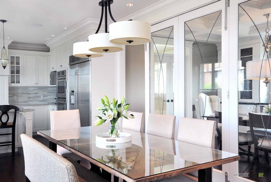 Для того чтобы привнести в помещение столовой или гостиной немного роскоши и блеска, можно использовать обеденный стол с зеркальной или стеклянной столешницей, ламинированной и глянцевой отделкой материала. При выборе стола или отдельно столешницы для него, важно удостовериться, что все края и углы (если таковые имеются) стеклянного материала хорошо обработаны, особенно это касается домов, где есть маленькие дети.