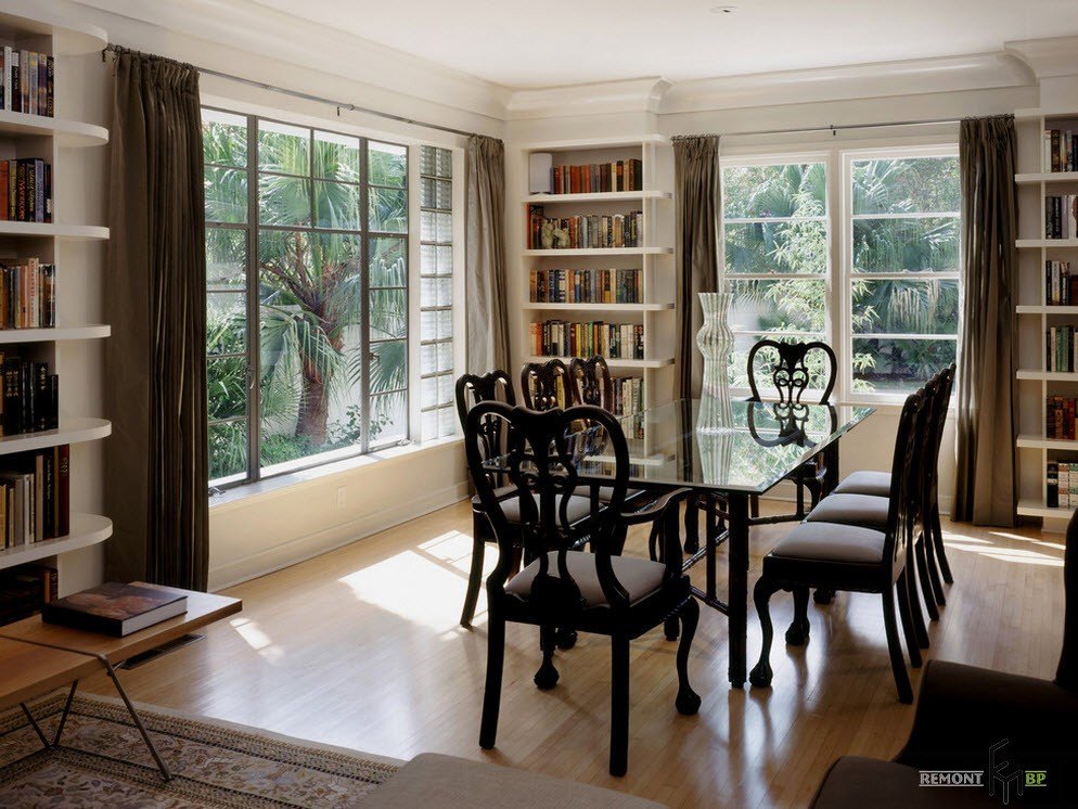 Просторная и светлая столовая, которая по совместительству является еще и библиотекой гармонично приняла обеденную группу в темных тонах. Резные деревянные стулья с мягкими сидениями вместе с обеденным столом со стеклянной столешницей создали роскошный ансамбль для трапезы восьмерых человек.
