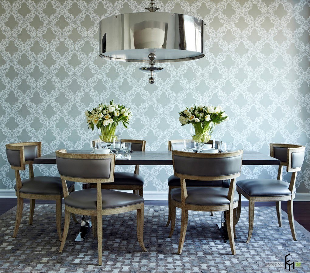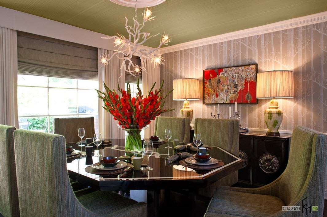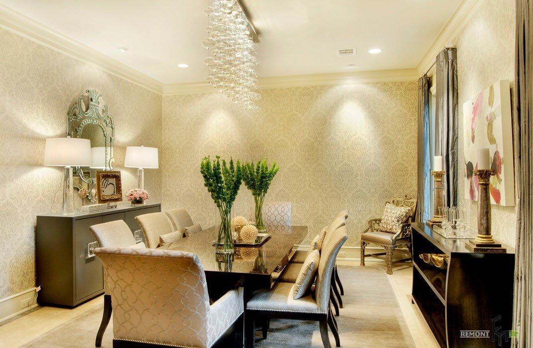 Этой обеденной зоне нельзя отказать в оригинальности – ножки стола выполнены из того же блестящего материала, что и подвесная лампа, обивка стульев-кресел отлично сочетается с ковровым покрытием и текстильными обоями. Весь интерьер производит впечатление роскоши и достатка, помещенного в оболочку уюта и комфорта.