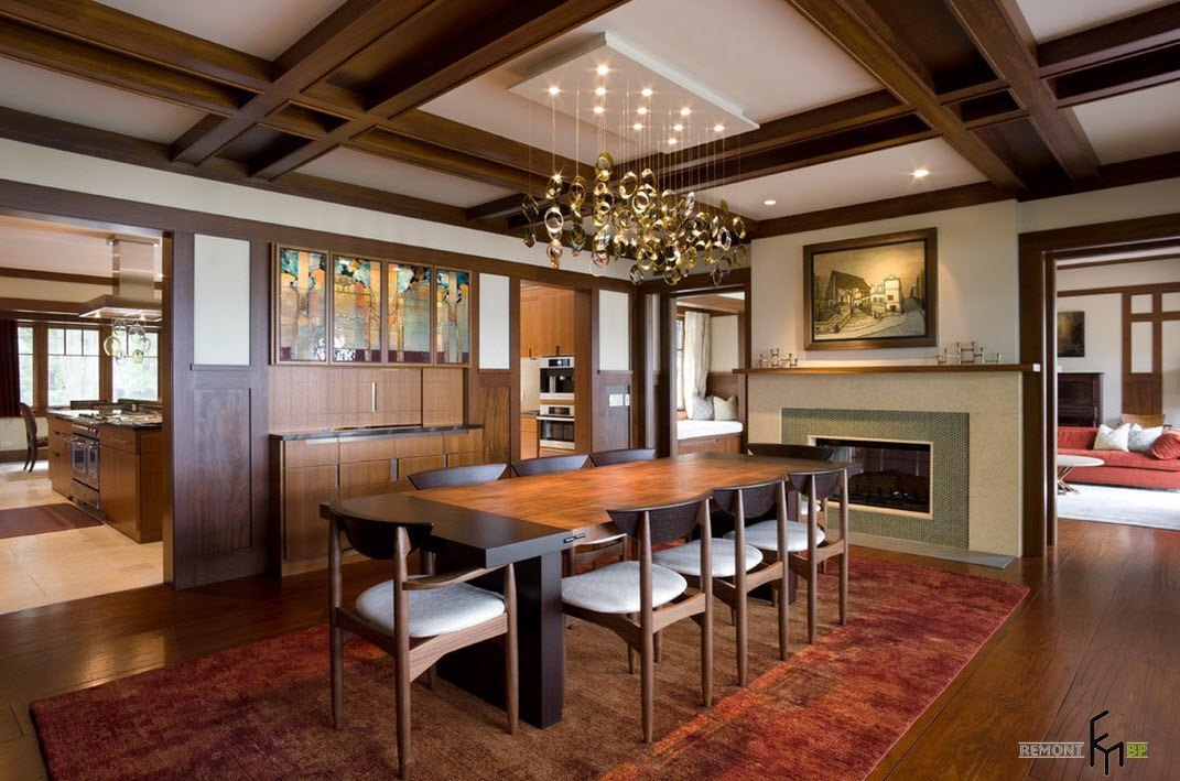Если вы желаете воссоздать в вашей столовой некое подобие обстановки средневекового замка, с его каменной кладкой, деревянными потолочными балками, камином и свечами, то большой деревянный стол с резьбой вам просто необходим. Расставьте вокруг старинного шедевра стулья, комфортные как кресла, подвесьте над обеденным столом шикарную люстру с обилием свисающих элементов и имитирующими свечи лампочками – средневековая обеденная зона на современный лад готова.